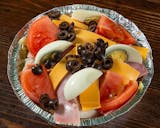 Lettuce, tomatoes, hard boiled eggs, ham, turkey, black olives, and American cheese.