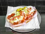 Salami, ham, mortadella, mozzarella, red onion, tomatoes, lettuce, Italian dressing, and mayo.